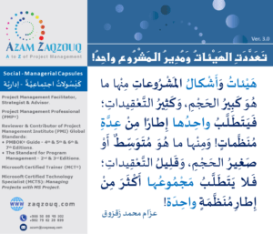 في قِطاع مَوقِعِنا الشَّبَكِيِّ ههُنا بيانٌ لنَموذَجِنا الاستِشاريِّ في بِناءِ مكاتب إدارة المشروعات/البرامج/المحافظ الاستثمارية (PMOs) بِوَصفِها كياناتٍ مُنَظَّمِيَّةٍ إستراتيجيةٍ تُديرُ كل ما هو مَشرُوعاتيّ (Projectized) من أعمال المنظمات؛ على اختِلافِها وتَنَوُّعِها وتَعَدُّدِها...