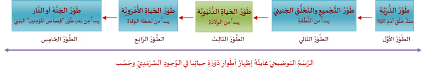 - طَوْرُ الحَياةِ الدُّنيَوِيَّة: وهو طَوْرٌ عامٌّ يبدأُ من الوِلادَةِ وينتهي بِبِدايَةِ طَوْرِ “الحَياةِ الأُخْرَوِيَّة” {عالَمُ شهادَةٍ}[14]. وهو الطَّوْرُ الأقْصَرُ أمَدًا، والمركَزِيُّ مِن بَينِ الأطْوارِ العامَّةِ جميعًا؛ لِتَعَلُّقِ الجَزاءِ والعِقابِ بِبَعضِهِ. وقِوامُهُ الأطوارُ البَيْنِيَّةُ التَّفصيلِيَّةُ الآتِيَة: